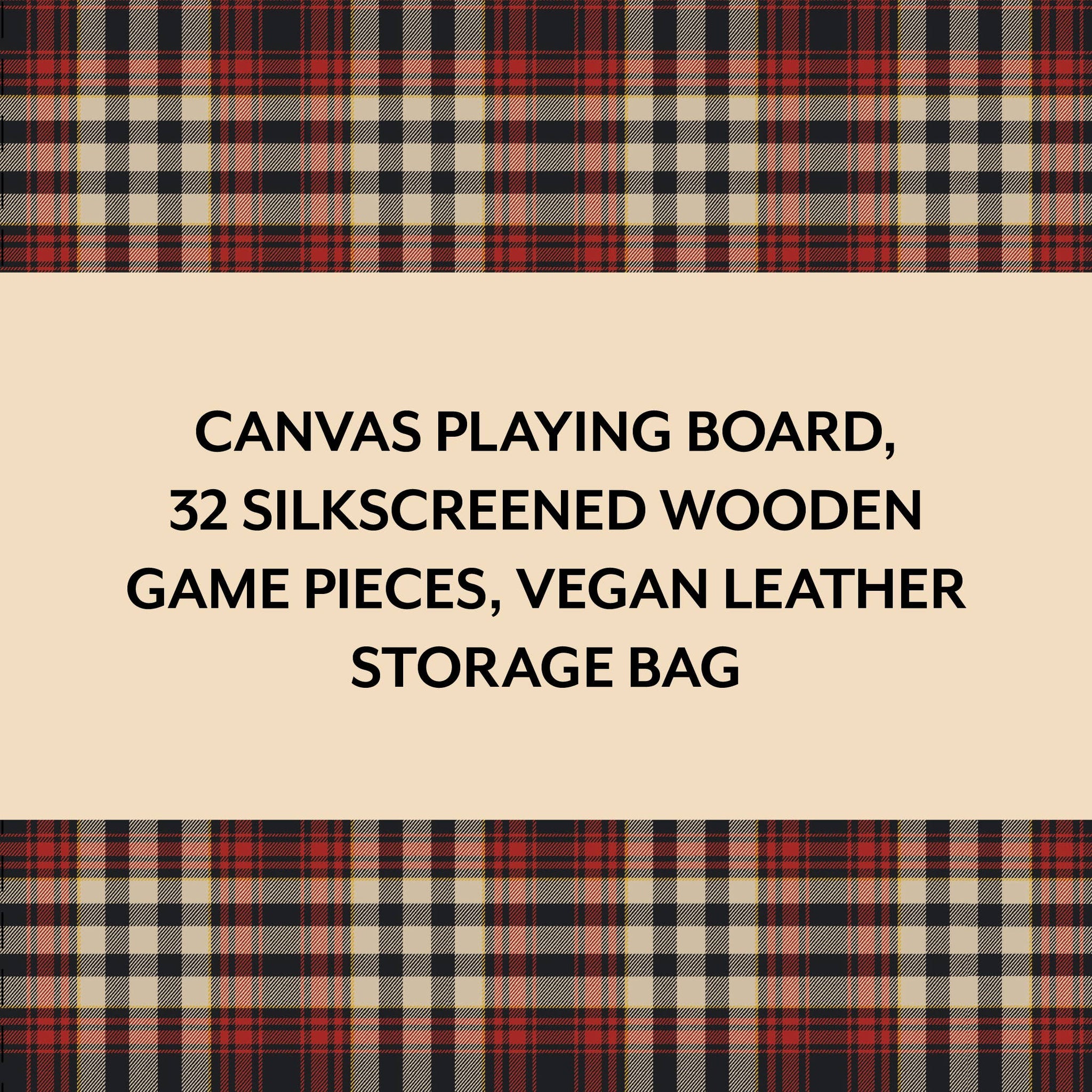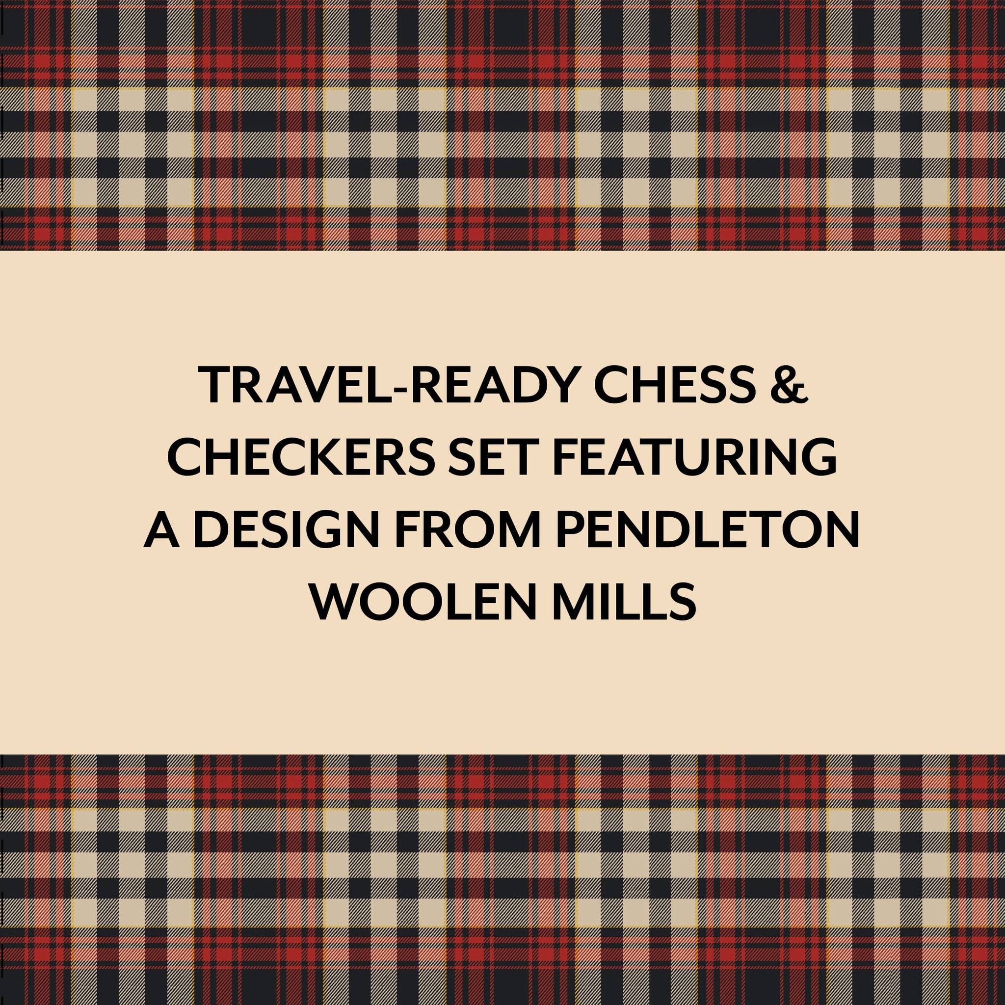 An exciting addition to the popular Pendleton game line: a Chess & Checkers set in the cozy and classic Red Black Check pattern. Roll out the fun at home, camp, or on the road with this travel-friendly game set. Canvas playing board features a colorful Pendleton pattern and rolls up for easy toting. The set includes 32 silkscreened wooden game pieces that reverse for play as chess or checkers, plus a vegan leather storage bag. Instructions included. CLASSIC PENDLETON PATTERN GAME: This travel-ready chess and checkers set from the iconic Pendleton brand features a canvas board and snap-on vegan leather pouch for storing pieces. TRAVEL CHESS & CHECKERS: Checkers and chess are classic board games enjoyed by all ages.